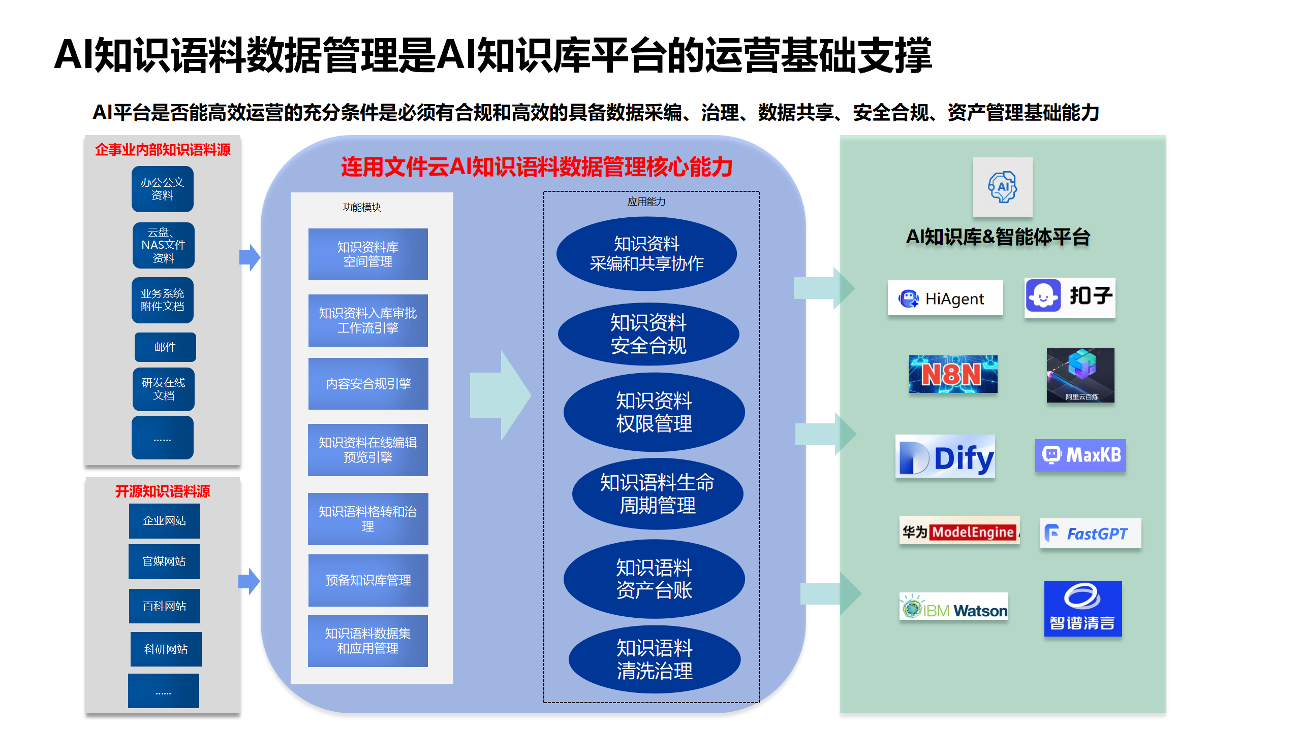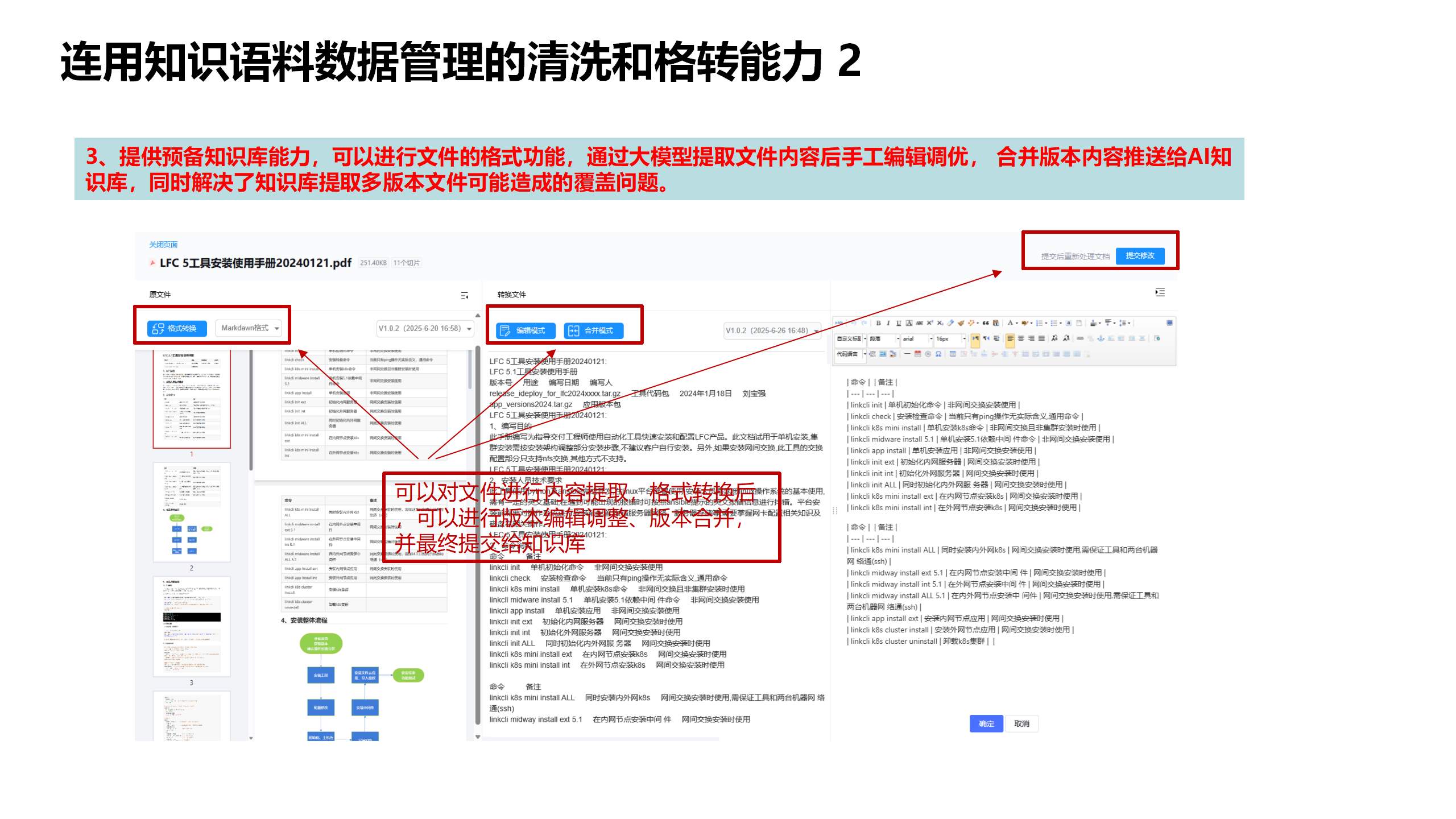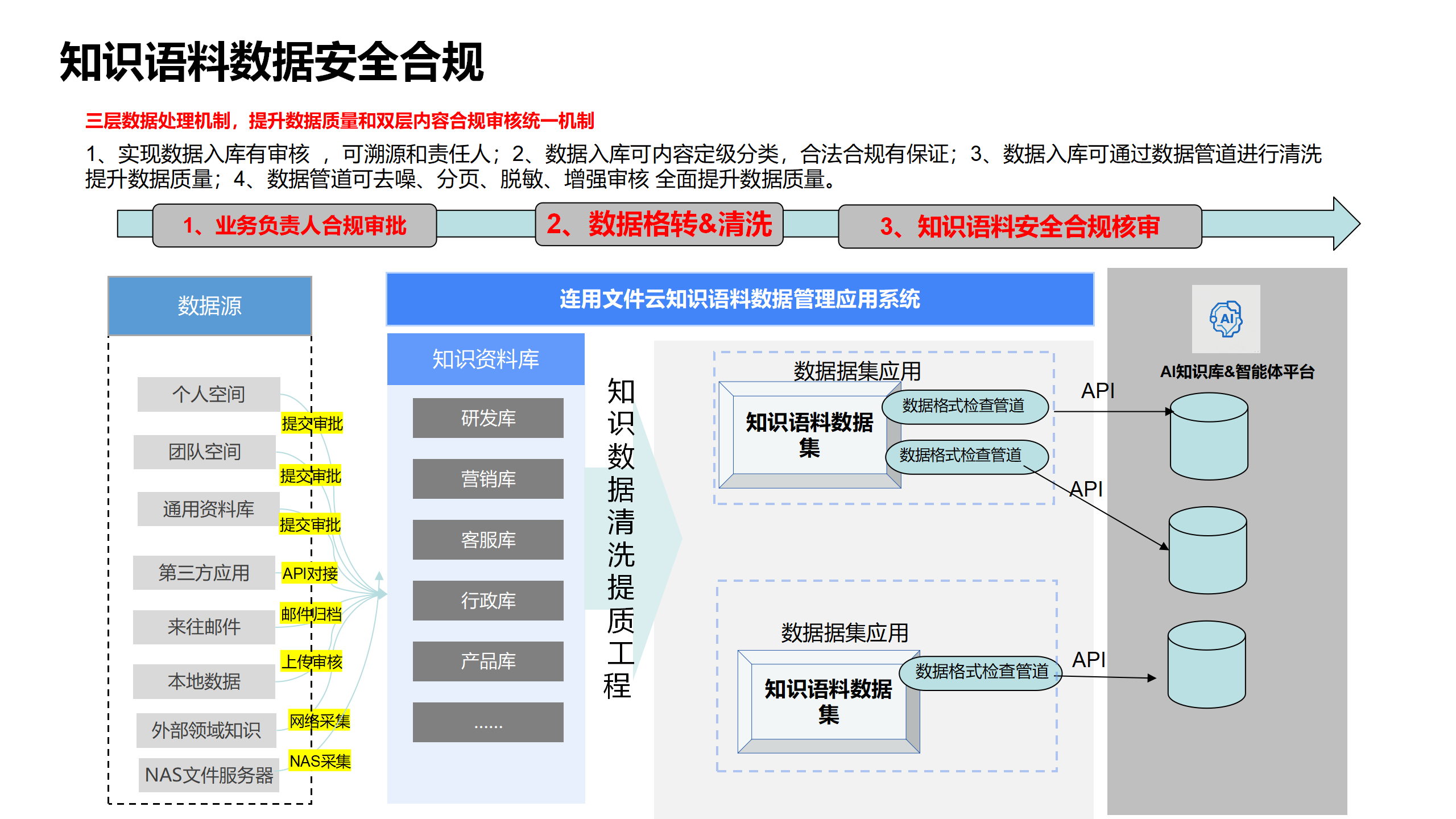一体化能力的从实现知识语料的在采集、在线编辑、审批入库能力到生成数据集到数据管理清洗、数据合规审核,最终推送给知识库。实现从知识语料到知识的及时生效全自动化流程,真正实现数据AI知识库应用的自动化生产流程。