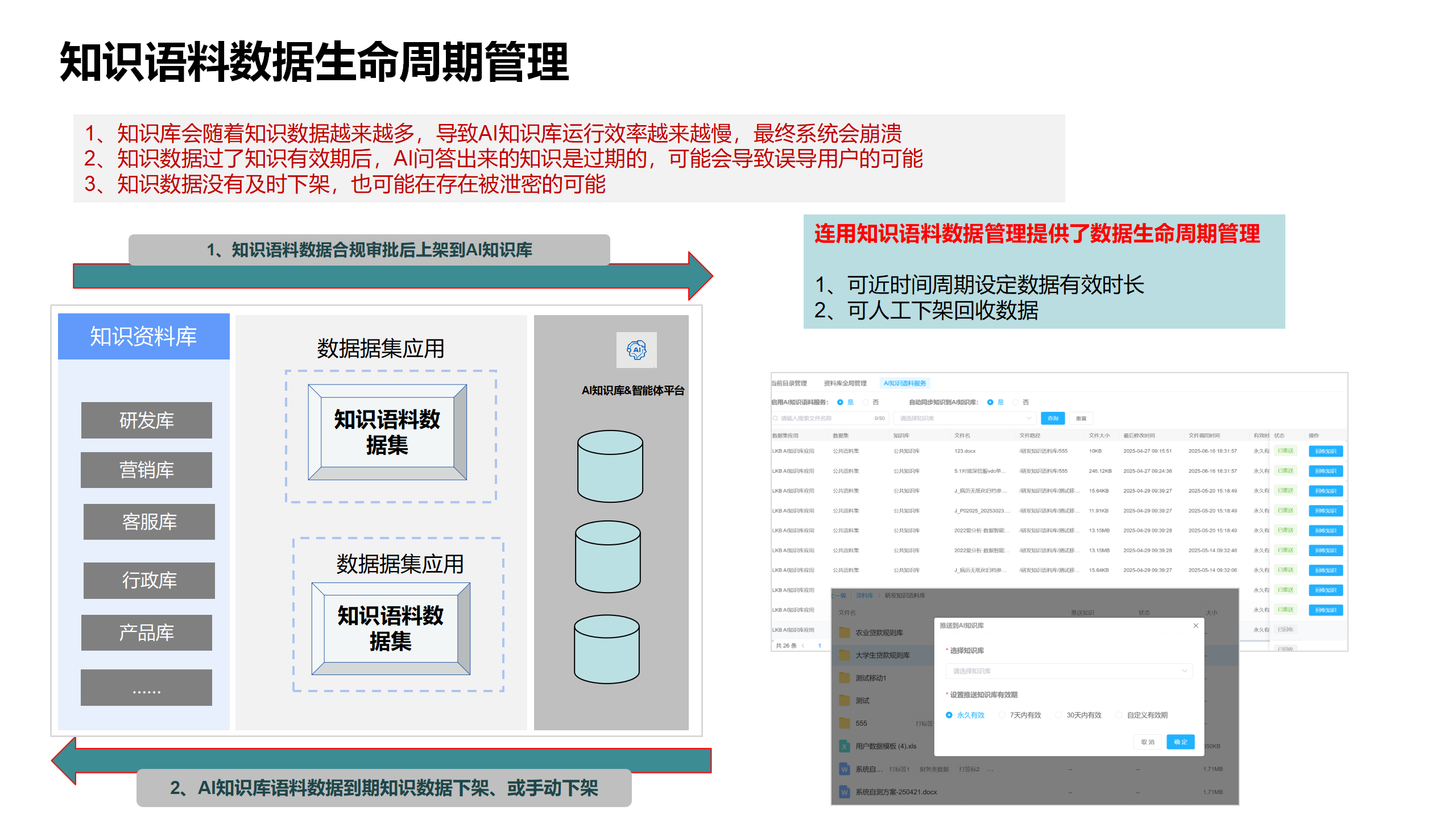 07知识数据按实际的业务有效期进行生命周期管理, 从知识上架到下架的全生命周期管理。可以对所有入到知识库、智能体平台的知识库数据做到台账管理, 保证数据使用资产全盘统计和监督。