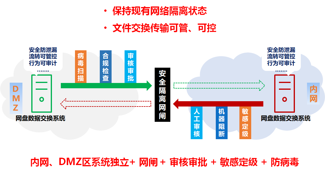 目前深圳禾正医院已经借助于网闸完成了内外网物理隔离,但在文档流转、存储管理方面,对文档操作无记录、重要涉密文档的流转缺乏管控等。文档数据需要进行内外部共享或分发时,主要通过诸如FTP文档服务器、Windows文档共享、U盘拷贝、通讯工具等传输工具,均会导致外发、共享含有敏感信息的文档流转不可见,并会发生文档被篡改、删除、权限难以控制等情况,文档的安全性得不到保障,且无法审计及追溯,对能接触到敏感数据的操作行为无监控及告警的能力。